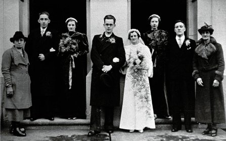 a wedding group: groom apparently wearing a clerical collar (from the Jones/Morris photographs)