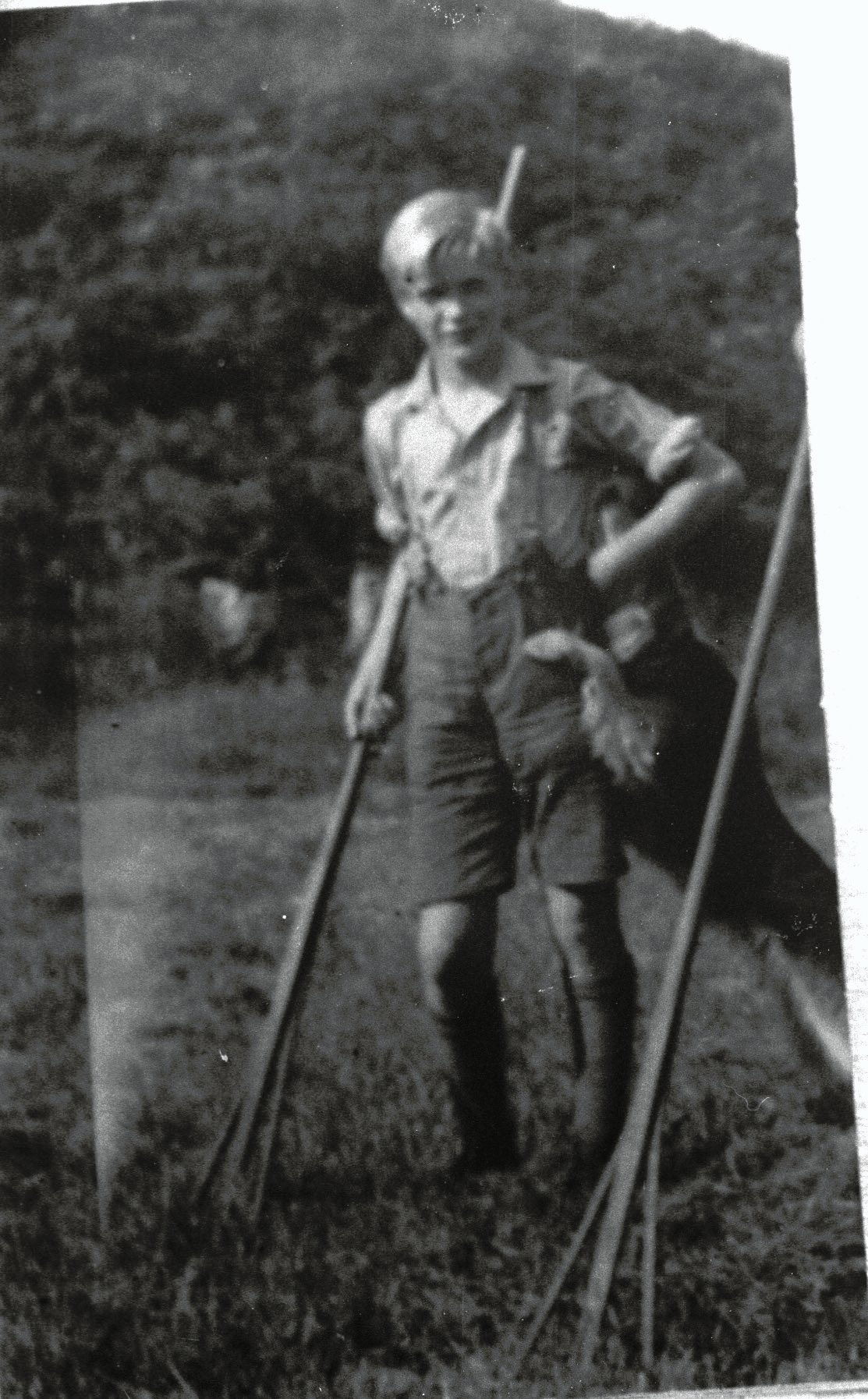 Bob in a field with a rake and a dog. 2 scans from one photograph.