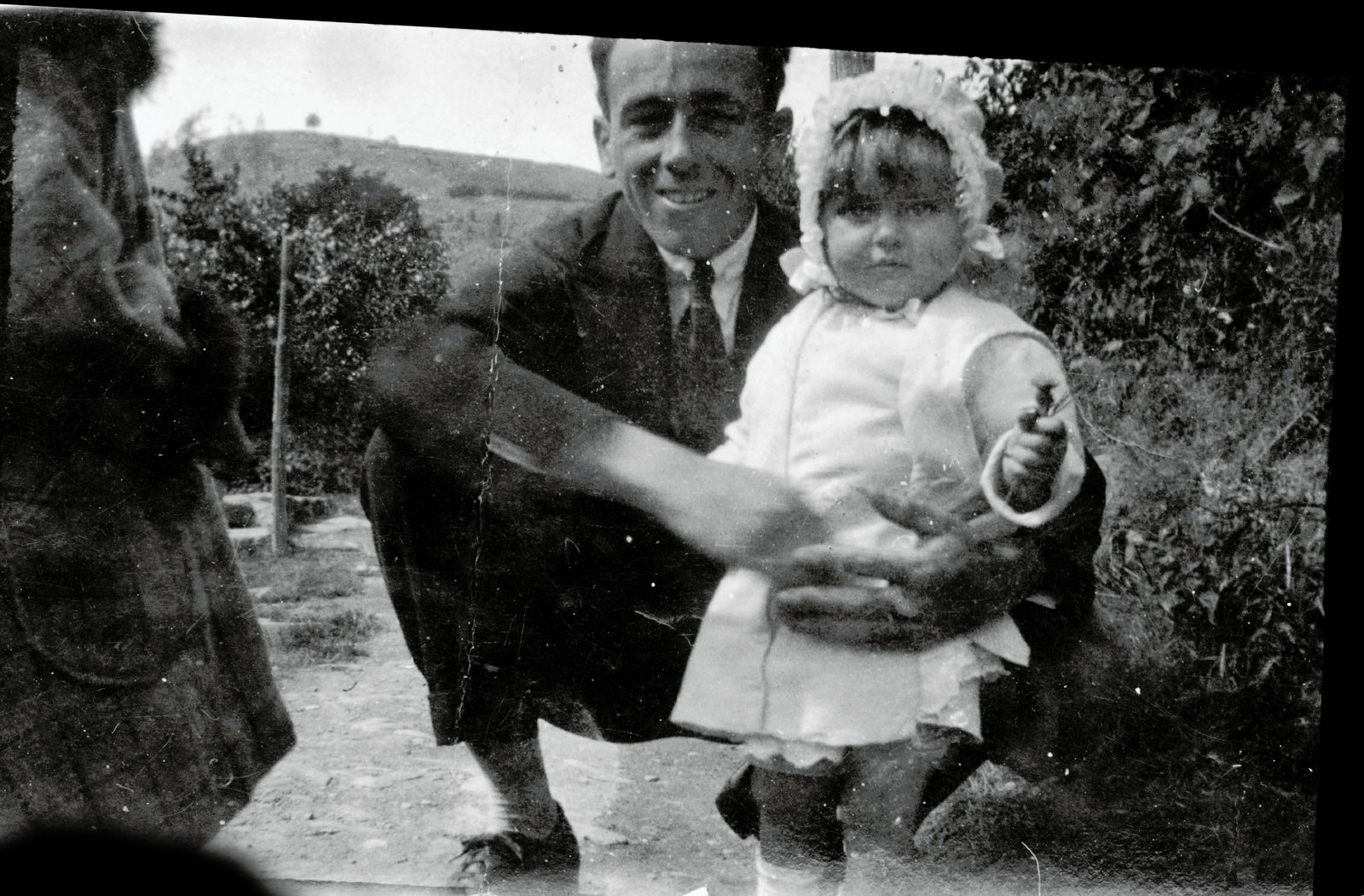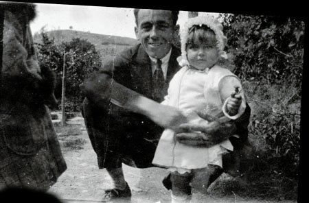 Gwyneth Jones, with Uncle Evan, probably at Hafodgynfor. 1920? Gwyneth is holding a wild flower. At the left, an unidentified woman in a coat with furry cuffs and collar.