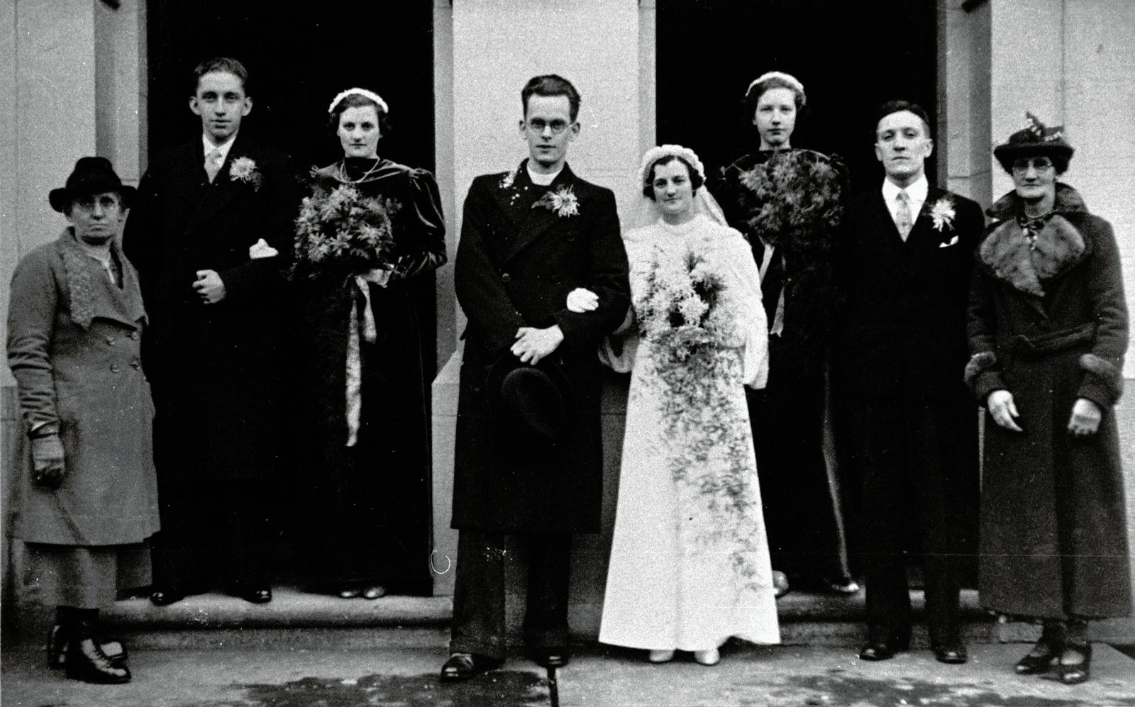 a wedding group: groom apparently wearing a clerical collar (from the Jones/Morris photographs)