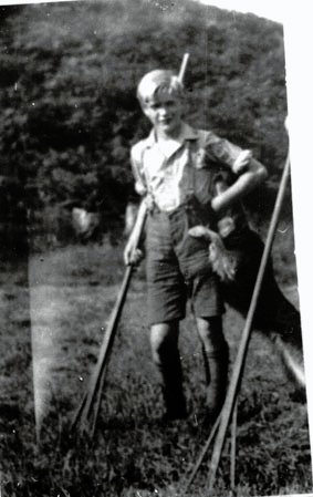 Bob in a field with a rake and a dog.
